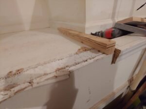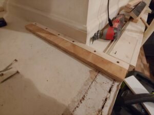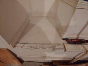 I started by cutting off the existing trim in line with the side of the opening using my oscillating multitool. This alcove has a subfloor already so I’m just going to put the first slide out shelf directly on top of that. If I was starting from the garage floor I’d build a shelf frame (seen later in this post) first that is just slightly off the floor (shimmed with pressure treated wood or composite material to handle moisture that might come up through the concrete slab), and then build the first slide out shelf on top of that.