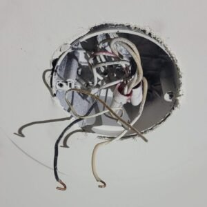 I began by shutting off the power to the lights at the breaker and the switch controlling the lights, and removed the light from the fixture base. Then I took the existing light fixture down leaving the old wires sticking out.